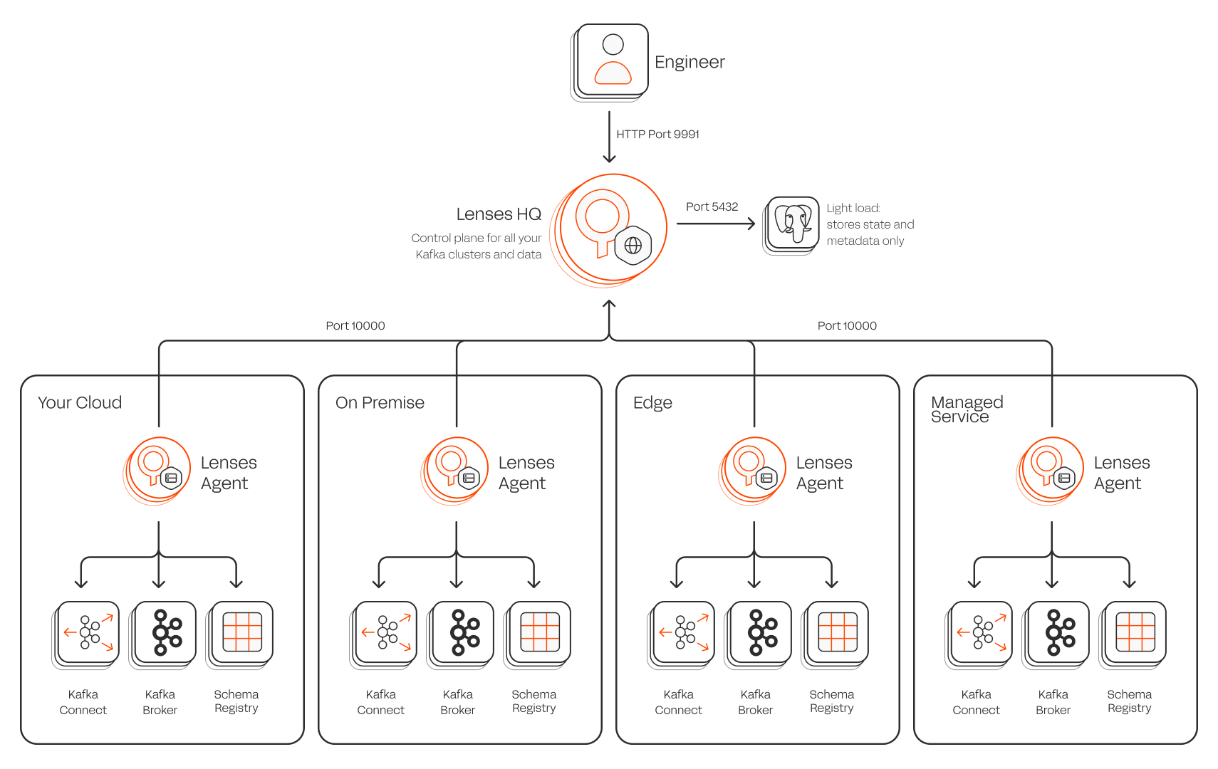 HQ is a single binary, installed on premise or in your cloud. From HQ you create environments which represent individual Kafka clusters and their supporting services. For each environment, you deploy an agent which connects to Kafka and back to HQ.