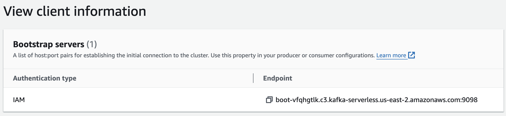 Click your MSK Serverless Cluster in the MSK console and select **View Client Information** page to check the bootstrap server endpoint.