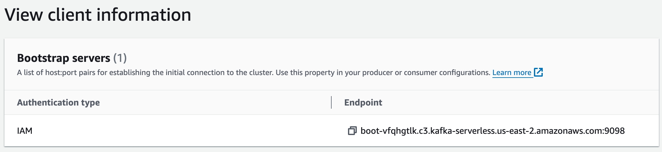 Click your MSK Serverless Cluster in the MSK console and select View Client Information page to check the bootstrap server endpoint.