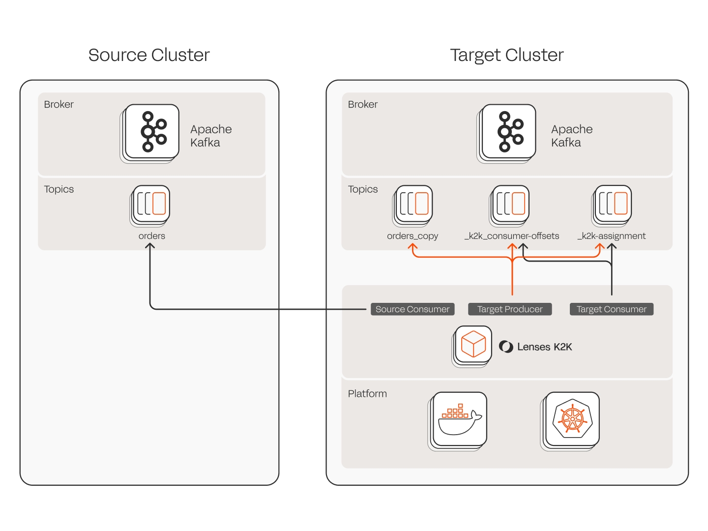 Lenses K2K is an application that allows you to replicate Kafka topics from one Kafka cluster to another.