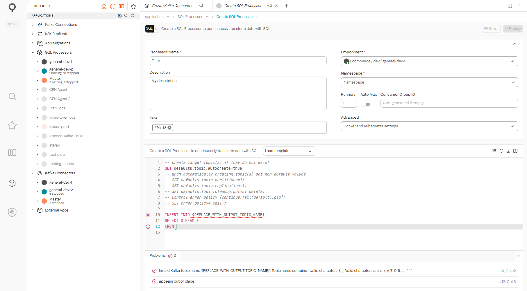 Use SQL Processors when data should be handled as it arrives. For example, you can filter records, join streams, aggregate metrics, and transform topics into new outputs.