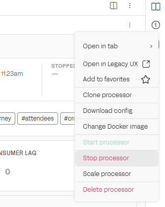 Stopping or deleting a processor interrupts active processing. Scaling changes the number of active replicas and can trigger consumer group rebalancing.