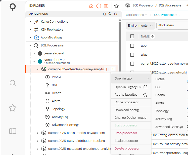 6. **Activity** — inspect the audit trail for the processor. See [Governance](https://docs.lenses.io/latest/user-guide/using/governance).